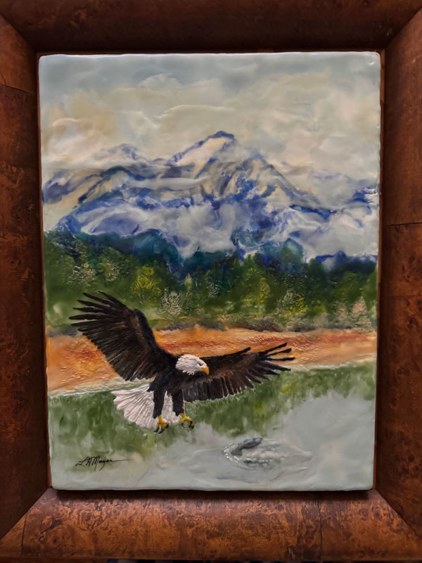 “Also, among the works you will see this year will be a mixed media piece produced by Angela Bledsoe. She entitles it Bouquet of Memories. The art piece is made from vintage brooches and jewelry. A couple of them are hers, but most belonged to her mother and grandmother. She found a way to display and enjoy them, instead of tucking them away somewhere. She describes her work as a three-generation art piece which brings a smile to her face each time she passes it,” says Linda.